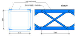 Tipología de sección compuesta cuadrada de 700x700 y cordones longitudinales mediante angulares de 120x120x12 mm. El arriostramiento de los cordones longitudinales se realiza con doble diagonal de 60x60x6 mm.